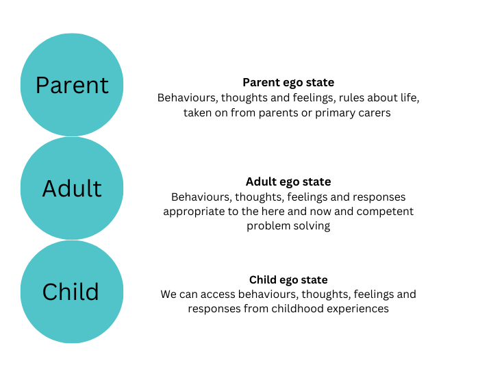 The ego state model shows that we have three ego states which we use to relate to ourselves and other people. We move through into different ego states depending on the situation.